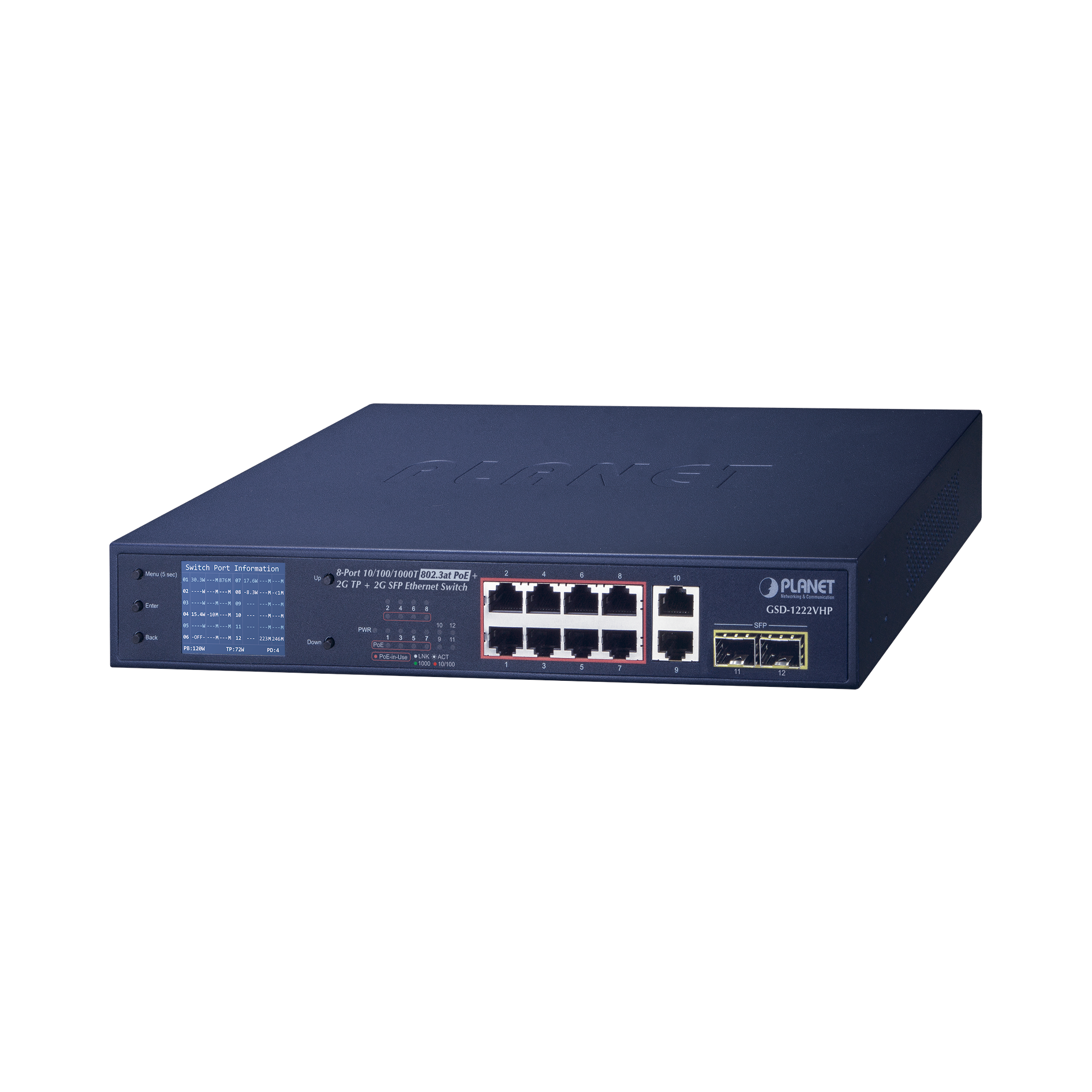 LANET GSD-1222VHP es una solución Power over Ethernet ideal Plug and Watch que proporciona una instalación rápida, monitoreo de estado de trabajo PoE en tiempo real y solución de problemas inmediata a través de su pantalla LCD única para mejorar la eficiencia y calidad del trabajo sin necesidad de PC o software.